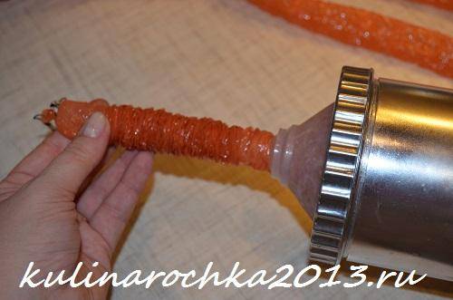 У меня для набивки есть хороший помощник — колбасный шприц. Отрезаем сосисочную оболочку (я использую полиамидную оболочку диаметром 24 мм.) и нанизываем на шприц.
