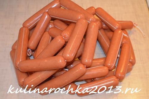 - Тесто предварительно размораживается. Сосиски аккуратно очищаются от полиэтиленовой упаковки.