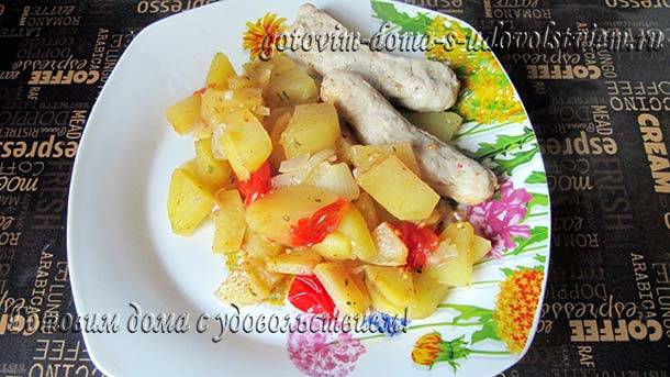 Затем выкладываем сосиски домашние мороженные в сковороду. Опять закрываем крышкой и тушим еще 5 минут.