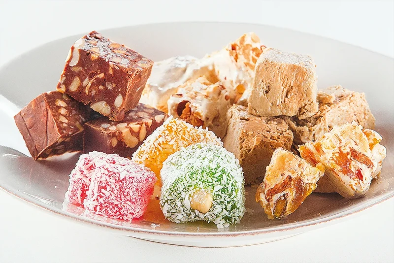 Особую любовь сластен со всего мира завоевал рахат-лукум. Десерт готовят на основе сахарного сиропа. В качестве добавок используют фруктовые наполнители, молоко, изюм, орехи и прочие продукты. Продается лакомство как на развес, так и в подарочных упаковках.
