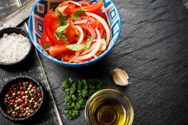 Помидоры и лук нарезаем тонкими полосками. Солим и добавляем сметану.