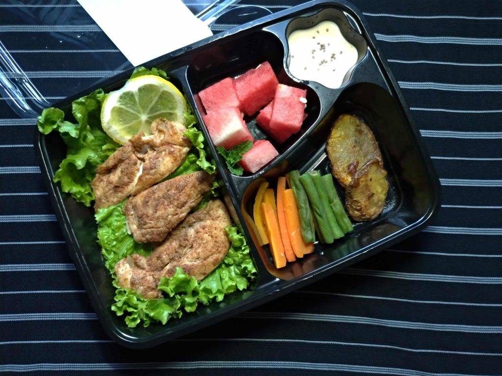 - кусочек запеченной, вареной куриной грудки или рыбы с овощами;