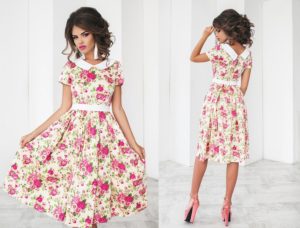 Наш первый совет — яркое платье миди (например, в пастельных или бежевых тонах) с нежным цветочным рисунком.