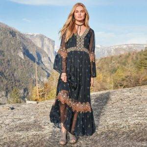 Как одеваться, когда хочется, независимо от сезона, выбрать черный цвет? Мы рекомендуем черное платье длиной макси, в стиле бохо в сочетании с балетками или босоножками на шпильке.