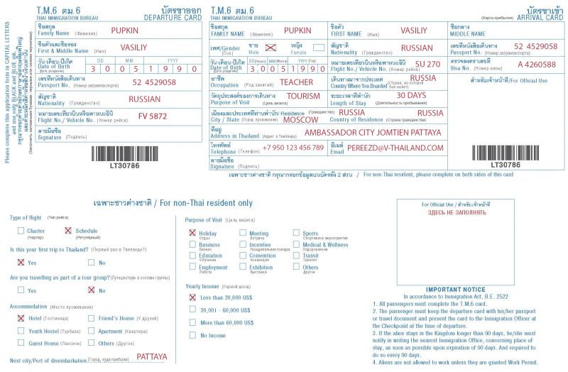 По прилету в солнечную страну каждый прибывший обязан заполнить иммиграционную карту, сообщив основные сведения о себе. Карта имеет две половины, одну путешественники заполняют сразу, и ее сотрудник таможни забирает в пункте прибытия, а вторую потребуют сдать при выезде/вылете из Таиланда.