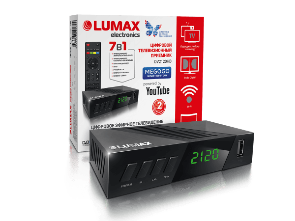 Добротный недорогой девайс российского бренда с поддержкой форматов вещания DVB-T/T2/C. В спецификациях устройства значатся мощный процессор, адаптер Wi-Fi, антенные вход и выход, коммуникационные разъемы RCA и HDMI. Приставка оснащена 2-мя портами USB, дисплеем, предустановленными приложениями Lumax, Megogo и YouTube. Предусмотрена поддержка функций PVR, TimeShift, EPG и разрешения FHD. Цена от 900 рублей.