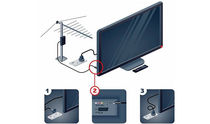 Если в антенне предусматривается установка усилителя приёма сигнала, то потребуется воткнуть блок питание в розетку. На этом процесс подключения цифрового телевидения к телевизору Smart TV заканчивается. Останется лишь настроить канала цифрового вещания.