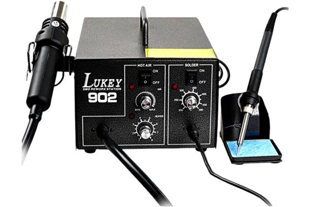 В паяльных станциях обычно есть паяльник с керамическим нагревателем. Лично мой выбор — именно такая станция. Паяльный фен (так называют термовоздушный паяльник) очень полезен в быту. Например, распаивать микросхемы (если нам надо отделить спаянные элементы) гораздо удобнее широким потоком горячего воздуха, чем тонким жалом обычного паяльника.