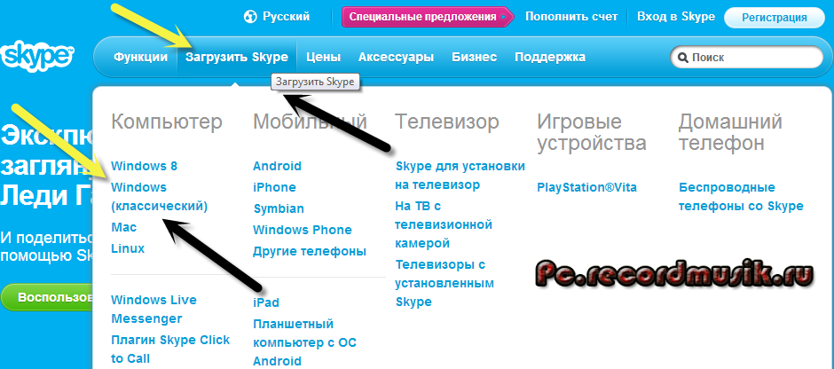 - Выбрать вкладку «Компьютер» и нажать кнопку «Skype для рабочего стола Windows».