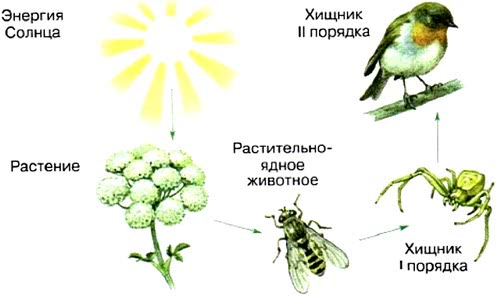 Для жизни всем организмам необходимо поступление энергии извне. Главным источником энергии для всех обитателей нашей планеты является Солнце. Солнечную энергию способны улавливать зелёные растения. Они преобразуют поглощённую энергию солнечных лучей в химическую энергию созданных ими органических веществ. Поедая зелёные растения, другие организмы получают необходимые им вещества и энергию (рис. 9).