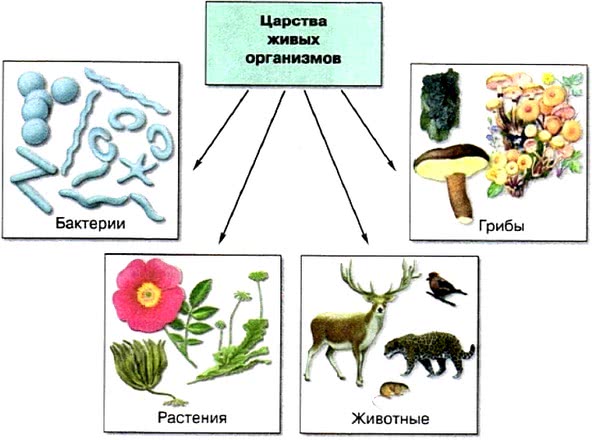 Царства живых организмов. Всё разнообразие живых организмов объединяют в несколько царств. В курсе школьной биологии чаще всего используется классификация, в которой выделяют четыре царства: Бактерии, Грибы, Растения и Животные (рис. 8).
