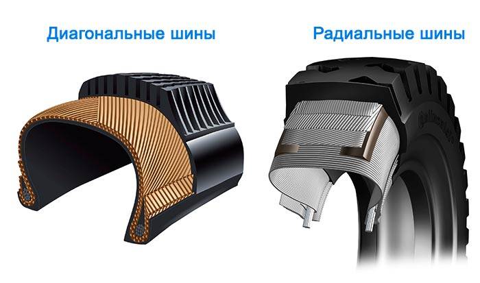 Как уже упоминалось ранее, шины радиальной конструкции маркируют буквой «R» в основном размерном индексе или надписью «Radial», а для диагональных эта буква просто отсутствует. Разница между этими покрышками заключается в расположении нитей корда, которые усиливают жесткость к скручиванию и нагрузкам на шине. В диагональных шинах стальные нити идут переплетаясь под прямым углом, а в радиальных нити равномерно располагаются от края одного борта к другому.