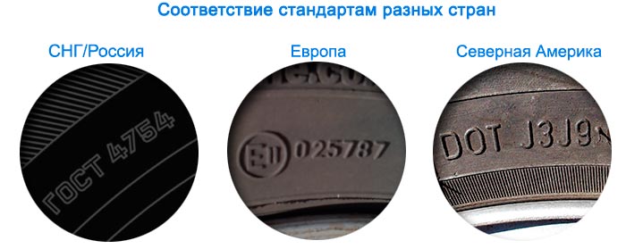 Шины, которые производят в странах СНГ и России в частности имеют надписи о принадлежности к гос стандартам или определенным техническим условиям. На боковине они наносятся кодом документа, к примеру: ГОСТ 4754-97 или ТУ2521-036-00148984-98. Кроме того на шины прошедшие сертификацию в России иногда наносят знак РСТ, который свидетельствует про наличие сертификата.