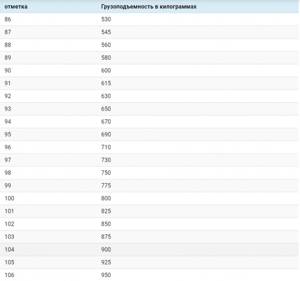 Индексу нагрузки присваивается числовое значение. На его основе определяется максимальная квота для транспортного средства, которую выдерживают колеса.