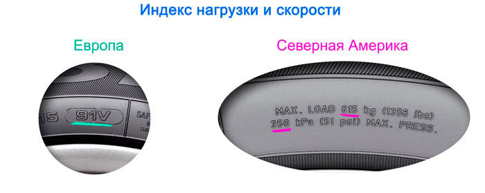 На шинах предназначенных для Североамериканского рынка также теснением нанесён параметр «Maximum Pressure», который измеряется в фунтах на квадратный дюйм (1 PSI = 0,068046 Атмосфер) и «Maximum Load», в фунтах или килограммах. Max. press. означает максимально допустимое давление в холодных покрышках, а Max. load — нагрузку.