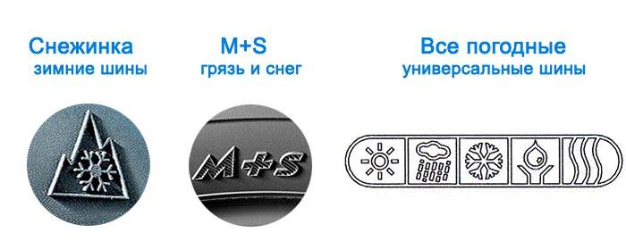- M+S (Mud+Snow) — переводится, как грязь и снег, ставится на всесезонной резине.