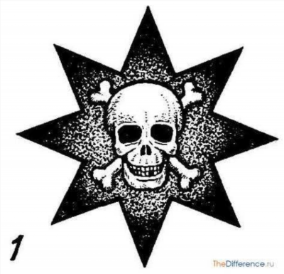 Значок молнии имеет одну трактовку – «дави ментов». А если внутри звезды набита свастика, то она означает «бей коммунистов», хотя сейчас в большинстве случаев она имеет более явный фашистский толк и означает «бей жидов».