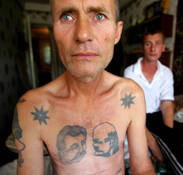 Звезды на груди означают, что заключенный является вором в законе. Звездочки на грудной клетке набивают и те, кто продвигает воровские понятия в тюрьме.