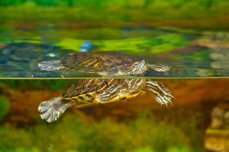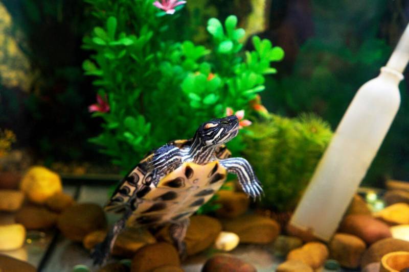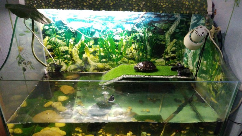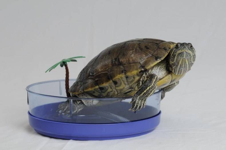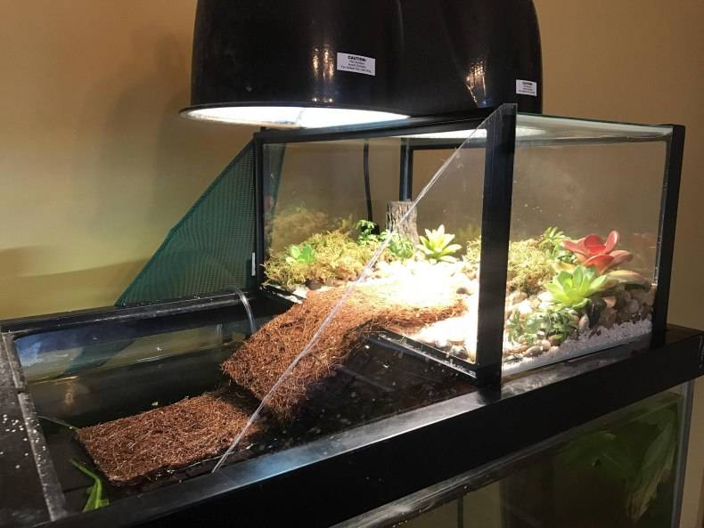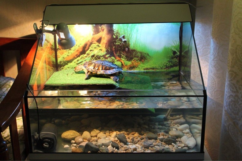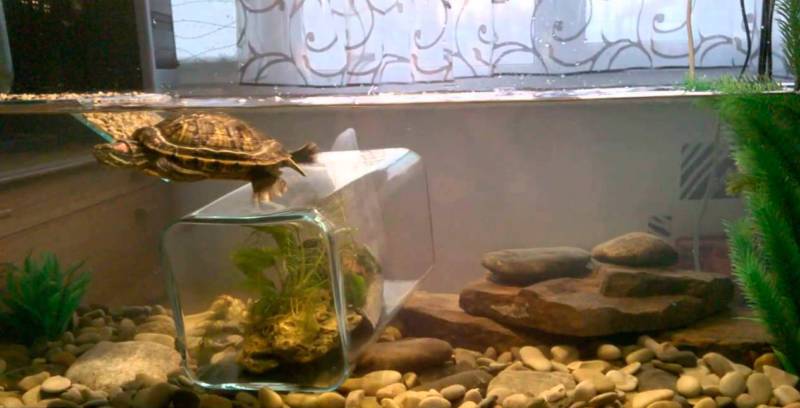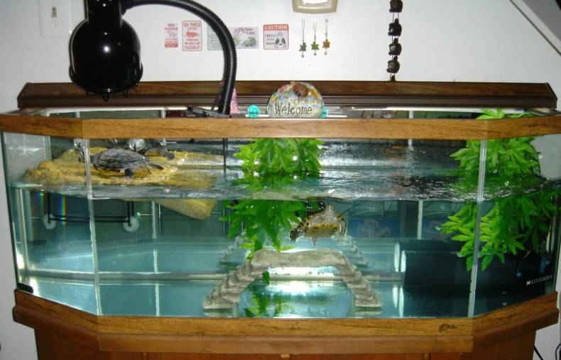 Обязательным условием жилища питомца является наличие островка, где черепашка сможет отдыхать и дышать. «Суша» должен быть пологой, чтобы Красноухая смогла взобраться на него самостоятельно.
