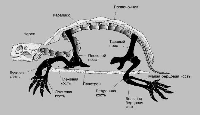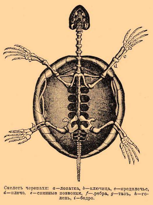 Чтобы ответить на вопрос, есть ли скелет у черепахи, вспомним, что тело рептилии делится анатомически на 4 части. Оно состоит из головы, шеи, туловища и хвоста. Рассмотрим строение черепахи в разрезе. Так, её позвоночник состоит из 5 отделов: шейного, грудного, поясничного, крестцового и хвостового. Скелет головы полностью костный. Он соединён с шеей посредством двух подвижных позвонков. Всего же у черепахи 8 шейных позвонков. Голова в момент опасности втягивается внутрь панциря, благодаря наличию в нём отверстия. Сухопутные рептилии воспринимают звуки низкой частоты. Черепах относят к «молчаливым» животным, так как их голосовые связки анатомически слабо развиты. Поэтому они издают шипение или писк.