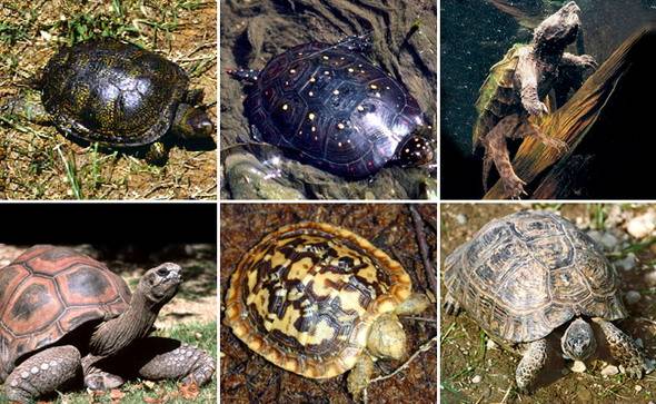Черепахи. Верхний ряд, слева направо: пресноводные черепахи (болотная черепаха, пятнистая черепаха), каймановы черепахи (аллигаторовая черепаха). Нижний ряд – наземные черепахи, слева направо: гигантская слоновая черепаха, эластичная черепаха, греческая черепаха