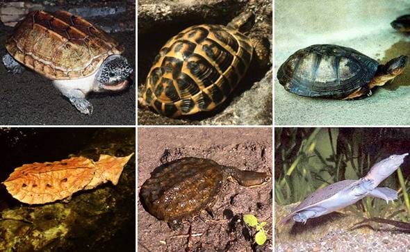 Черепахи. Верхний ряд, слева направо: циностерны (крестогрудная черепаха), пеломедузы (тартаруга, восточноафриканская бокошейная черепаха). Нижний ряд, слева направо: змеиношейные черепахи (матамата, аргентинская гидромедуза), трёхкоготные черепахи (китайский трионикс)
