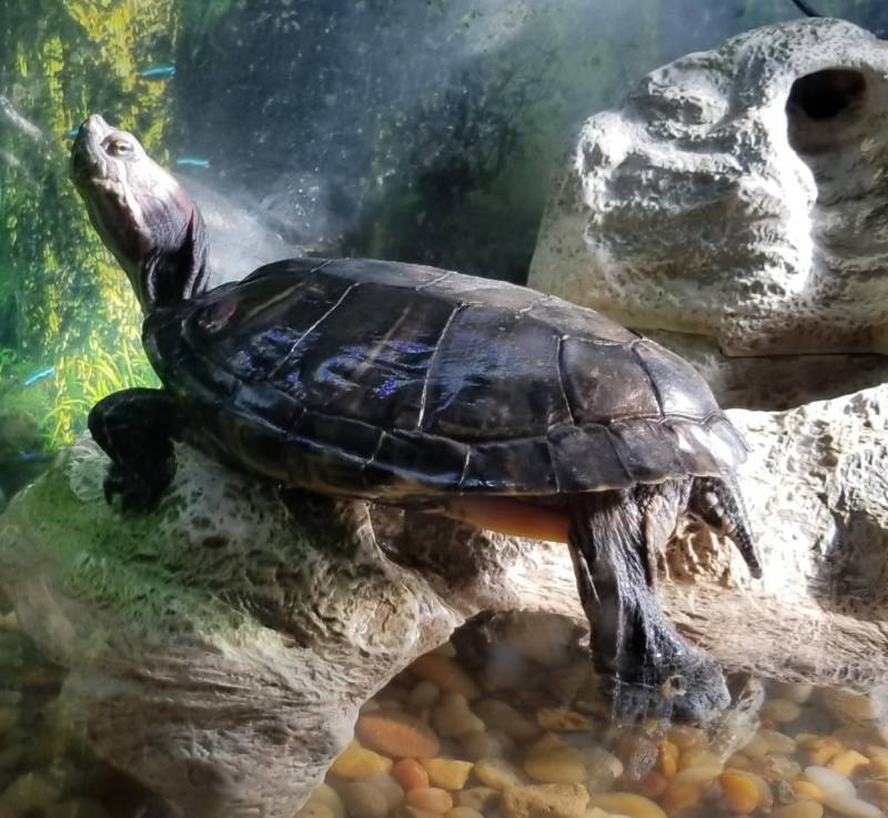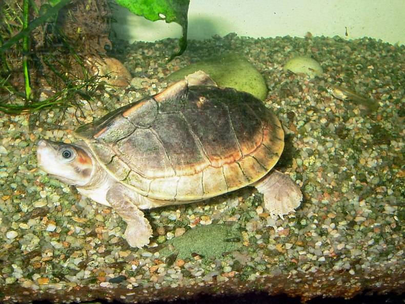 Ареал обитания черепах – восточные районы США. Самый небольшой представитель аквариумных рептилий. Взрослая черепаха в среднем имеет панцирь длиной 7 см. Особенности породы – очень длинная шея и специфический запах, который появляется при испуге животного. В природе предпочитает пресные илистые водоемы. Панцирь имеет темный окрас. Тело серого оттенка, заметны полоски. На лапках острые коготки. На хозяина не нападает, но в руках у незнакомца ведет себя агрессивно. Живет около 20 лет.