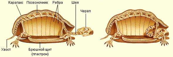 Оба они покрыты прочными роговыми щитками, благодаря чему черепаха может выдержать массу, в десятки раз превышающую собственный вес. Это покрытие состоит из большого числа костей, внешне напоминает грудную клетку, размещенную снаружи тела. Имея собственную кровеносную систему и сосуды, он может кровоточить, причиняя боль.