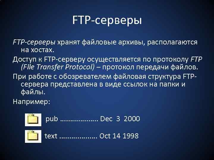 Формально FTP подразумевает подключение к определенной папке, которая находится на сервере, посредством Интернет. Несмотря на внушительный возраст, этот протокол до сих пор используется для передачи файлов, доступа к удаленным хостам и распространения программного обеспечения.
