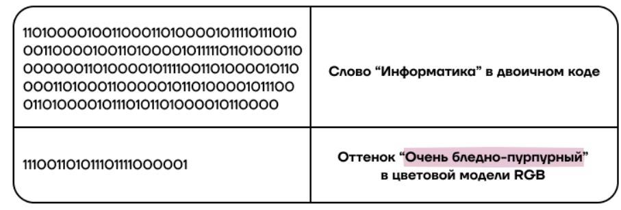 «Мозг» компьютера устроен так, что он способен запомнить и обработать только два символа — 0 и 1. Всю информацию для себя он представляет в виде последовательности этих двух цифр — это и есть двоичный код.