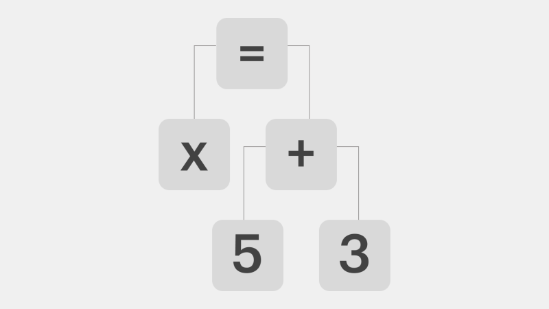 Мы видим, что на вершине находится главная операция — присваивание переменной x результата сложения двух чисел. От неё отходит две ветви — сама переменная x и символ сложения, который ветвится на слагаемые числа.