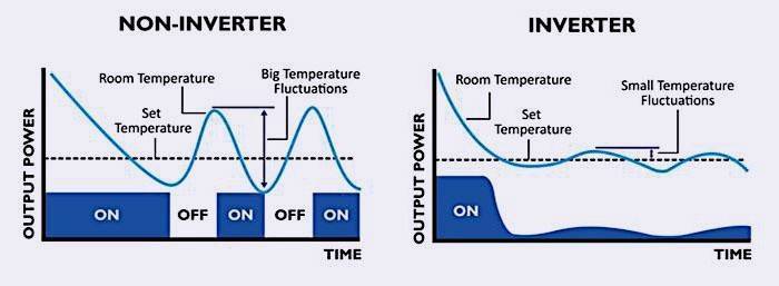 По достижению заданного температурного режима снижаются обороты агрегата, он продолжает работу уже на пониженной мощности, которой хватает для поддержания нужной температуры. Большинство бюджетных инверторных сплит-систем все же полностью отключаются, но гораздо реже, чем обыкновенные модели охладителей воздуха. Только дорогие агрегаты, мощность которых изменяется в пределах от 5 до 90%, способны почти не отключаться.