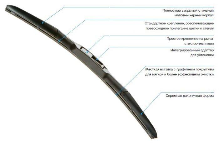 Конструкция основана на обычном каркасном дворнике. Но он плотно закрывается кожухом из пластика или металла. Этот кожух полностью повторяет форму щетки. Так вес становится больше, но и дворник прилегает намного плотнее.