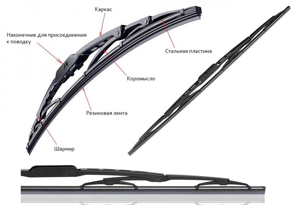 Практически все они, вне зависимости от производителя, выполнены по одному принципу. Это основа из металла или пластика, которая покрывается резиной или каучуком. Имеют сменные крепления в центре. Снизу фиксируется резинка очистителя.