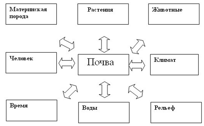 Впервые эту тесную причинную взаимосвязь между природными условиями, характером почвообразования и свойствами почвы установил В.В.Докучаев. Он же и выявил основные факторы почвообразования, которыми являются: