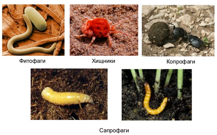 На фото выше представлены представители животного мира, которые принимают участие в процессе образования почвы. Фитофаги – это животные, которые питаются растениями (капустная муха, колорадский жук). Хищники (пауки, скорпионы) в свою очередь поедают фитофагов. Продукты их жизнедеятельности оказывают влияние на химический состав почвы. За переработку экскрементов отвечают копрофаги (мухи-маньяки, муравьи, жуки-навозники). А сапрофаги (дождевые черви, клещи), кроме того, что питаются останками животных, также образуют ходы в грунте, участвуют в формировании торфа.