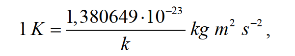 Кельвин, символ К, является единицей термодинамической температуры и определяется путем установления фиксированного числового значения постоянной Больцмана k равным 1,380649·10–23 в единицах Дж / К (J / K) , что соответствует кг · м2 · с–2 К-1, где килограмм, метр и секунда определены через константы h , c и ΔvCs .