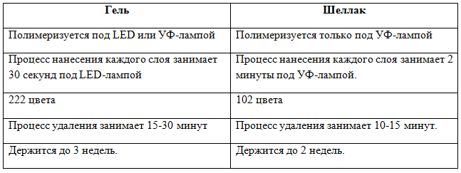 Приведем небольшую таблицу сравнения геля с гель-лаком: