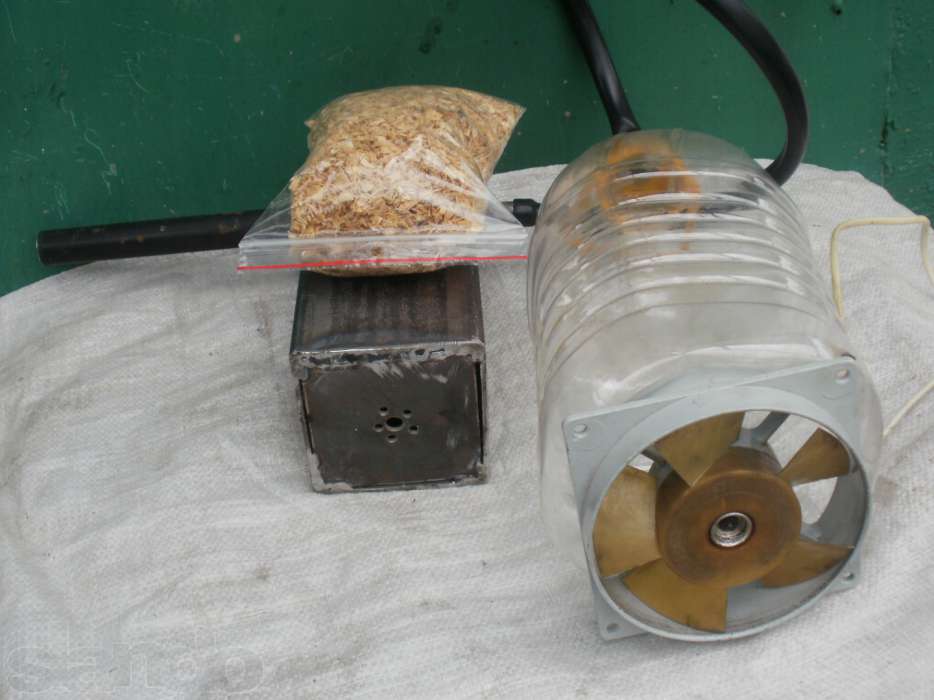Компрессор своими руками можно соорудить из кулера от компьютера или кухонного вентилятора, размещенных в пластиковых бутылках. Эжектор создает тягу, за счет которой лучше происходит розжиг щепы и поддерживается их тление.