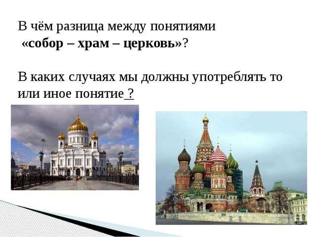 Из данных определений можно вывести несколько различий собора и церкви, а именно: