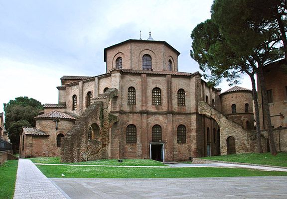 Первые христианские храмы строились по типу базилик — прямоугольных зданий с нечетным количеством нефов, отделенных друг от друга колоннами (базилика Сан-Витале, Равенна)