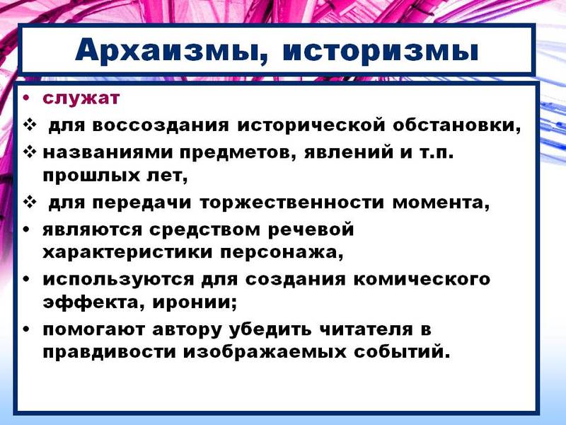 Архаизмы использовались писателями и поэтами, чтобы придать тексту смысл