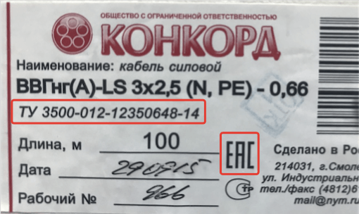 - Убедитесь, что информация из документов соответствует параметрам проводника, указанных на фирменной этикетке (должна быть на бухте или барабане).