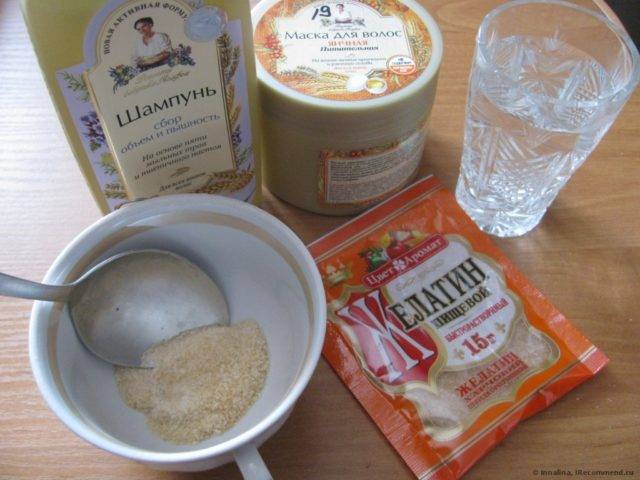 Для приготовления нужен 1 пакет желатина, полных 3 ст л воды, половина ложки любого бальзама. Ингредиенты перемешиваются, доводятся до густой, однородной массы в виде сметаны. Прогревать феном обработанные средством пряди нужно, примерно полчаса, плюс после обрабатывания держать ещё 10 мин. Смывать тёплой проточной водой.