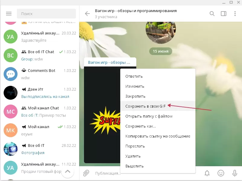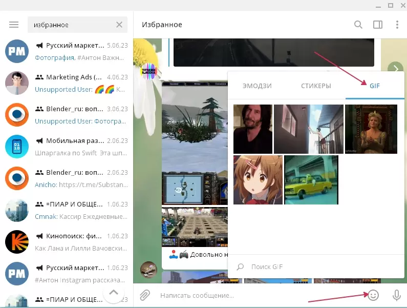 - Откройте Telegram, выберите чат (или «Избранное», чтобы сохранить гифку для себя).