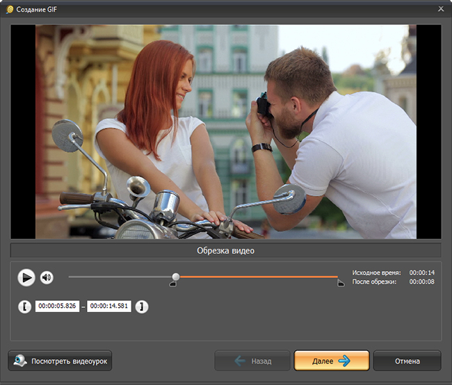 Вернитесь в основную рабочую область и кликните по иконке GIF над плеером. Выставите границы обрезки с помощью черных маркеров. Затем определитесь с размером изображения: выберите один из предложенных вариантов или скорректируйте параметры вручную.