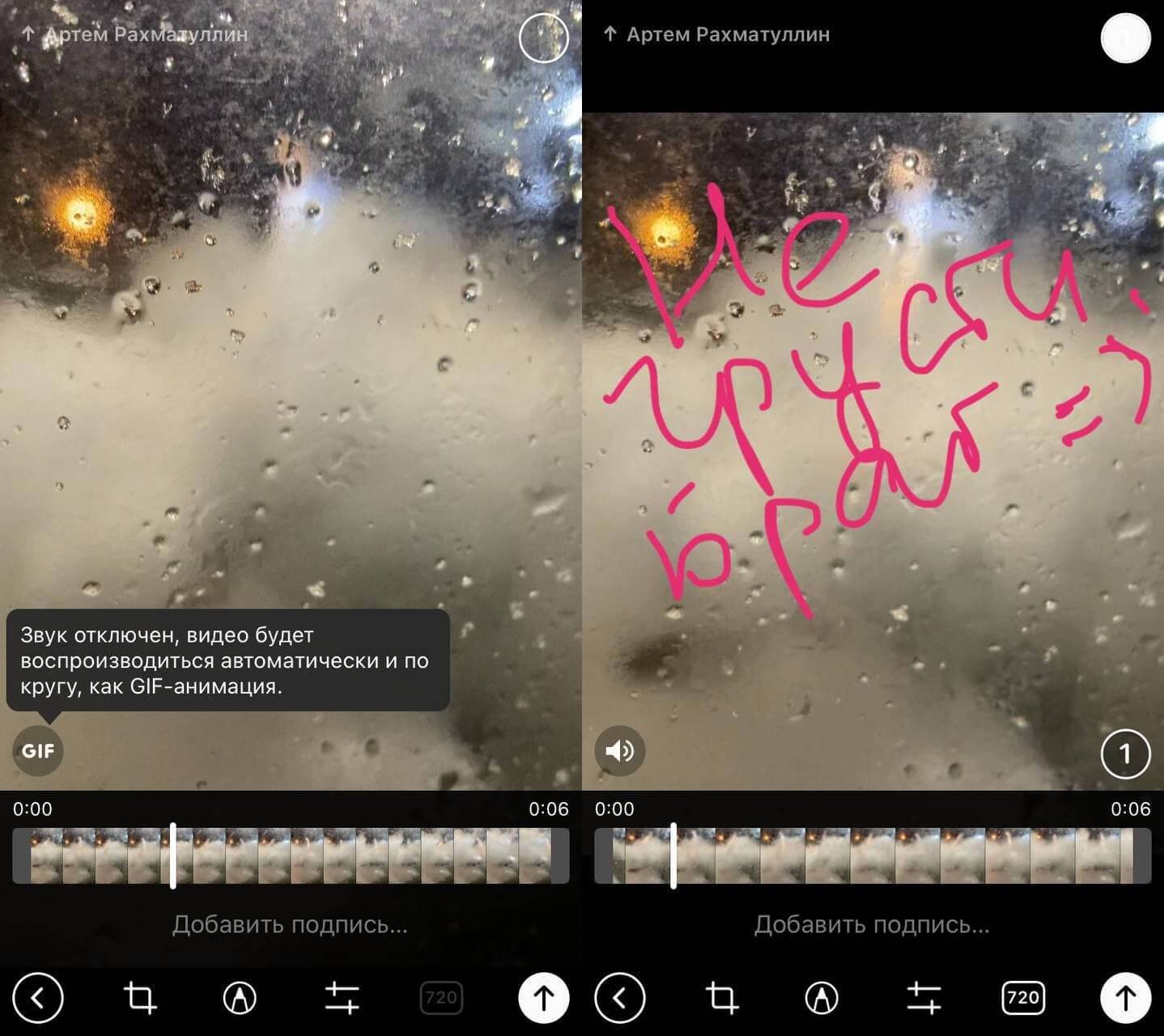 Еще один альтернативный способ легко и быстро сделать гифку связан с мессенджером Telegram и для этого вам не понадобятся никакие сторонние приложения. Работает все просто: когда вы загружаете видео в Телеграм, вам доступно несколько инструментов для редактирования, в том числе, обрезка, выбор качества и таймер для последующего удаления ролика. Если в этот момент выбрать загрузку видео без звука, ролик конвертируется в формат GIF-анимации. Так его отправить собеседнику, в таком же виде он может “гулять” по просторам Телеги. Вот только за ее пределы не выберется: если попытаться сохранить ролик на устройство, вы получите формат MP4, то есть опять-таки видео.