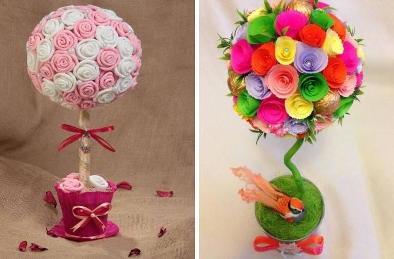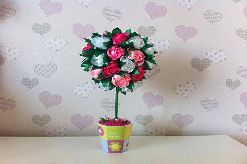 Топиарий в интерьере – это, как правило, искусственно созданное деревце с круглой кроной. В нашем случае вместо листиков импровизированное растение будут украшать розы.