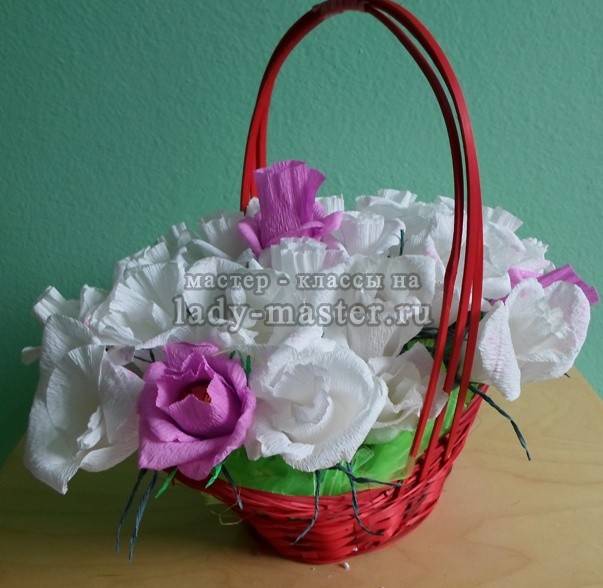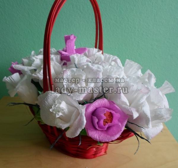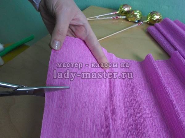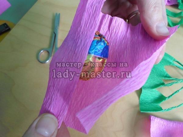 В розы из гофрированной (крепированной) бумаги можно завернуть конфеты, получится оригинальный, вкусный подарок.