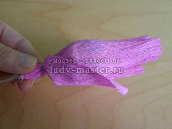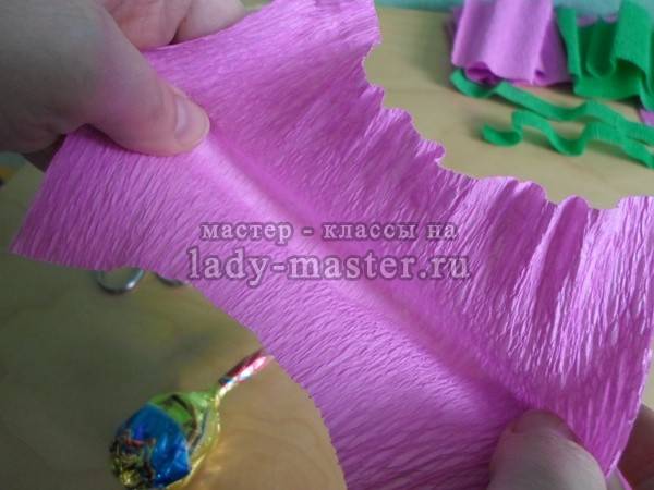 Из розовой гофрированной бумаги вырежьте полосу шириной 10*35 см. С одной стороны делаем загиб 1см., делая растягивающие движения вперед-назад, как показано на фото.